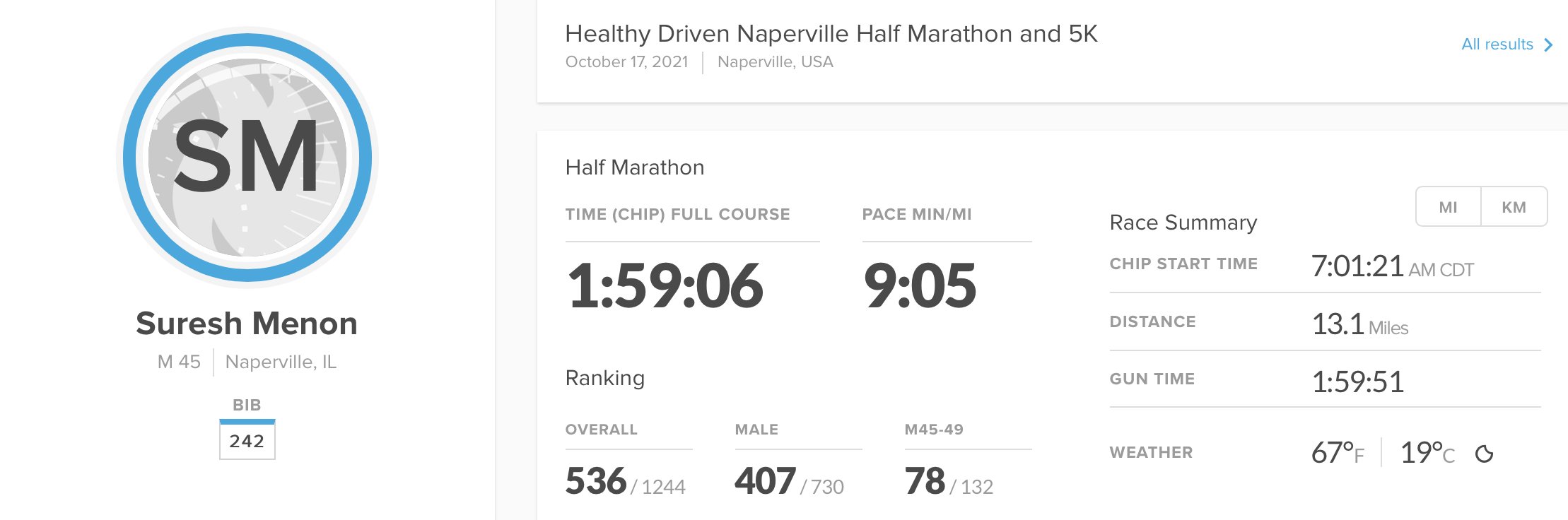 I ran my first half marathon (13.1 miles) on May 1, 2005 with a 2:10:41 run time. Back then, I was 29 years old with a body that was more resilient and definitely lighter. On Oct 17, 2021 I ran another half marathon with a 1:59:06 run time. Now, I am 45 years old with a body not as resilient and weigh around 200 pounds. To my delight I was 11 minutes 35 seconds faster and finished strong.