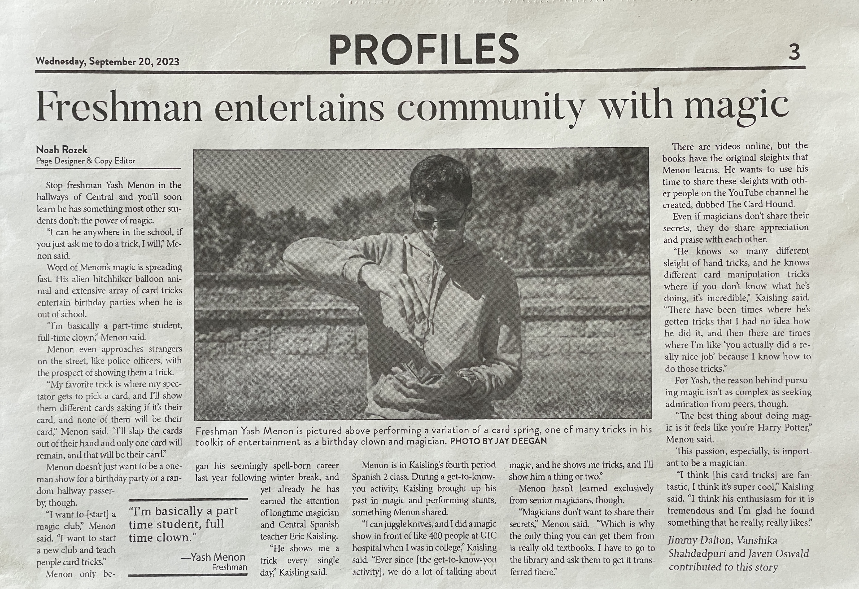 Unlike David Blaine, I can’t spit out a dozen frogs, but I can enthrall you with my card tricks. I have performed on the streets of Naperville, in Costco, in restaurants, parties, airports and at homes. Some of my “best” uncles and aunts invited me for short gigs at their events, where I earned some crisp dollars. Here’s a BIG thank you to those “best” uncles and aunts. To others who are vying to get into this “best” circle, it is super simple…just text me your event details!